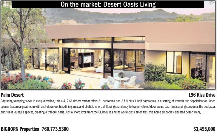 On the market: Desert Oasis Living Palm Desert 196 Kiva Drive Capturing sweeping views in every direction, this 4,412 SF desert retreat offers 3+ bedrooms and 3 full plus 1 half bathrooms in a setting of warmth and sophistication. Open spaces feature a great room with a sit-down wet bar, dining area, and chef’s kitchen, all flowing seamlessly to two private outdoor areas. Lush landscaping surrounds the pool, spa, and sunlit lounging spaces, creating a tranquil oasis. Just a short stroll from the Clubhouse and its world-class amenities, this home embodies elevated desert living. BIGHORN Properties 760.773.5300 $3,495,000
