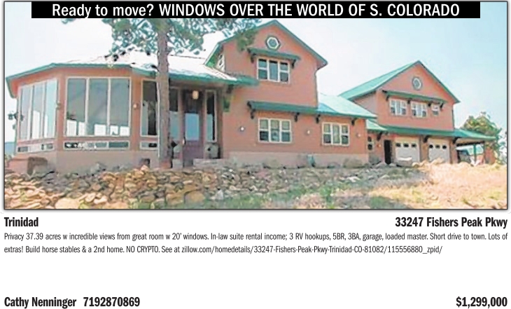 Ready to move? WINDOWS OVER THE WORLD OF S. COLORADO Trinidad 33247 Fishers Peak Pkwy Privacy 37.39 acres w incredible views from great room w 20’ windows. In-law suite rental income; 3 RV hookups, 5BR, 3BA, garage, loaded master. Short drive to town. Lots of extras! Build horse stables & a 2nd home. NO CRYPTO. See at zillow.com/homedetails/33247-Fishers-Peak-Pkwy-Trinidad-CO-81082/115556880_zpid/ Cathy Nenninger 7192870869 $1,299,000