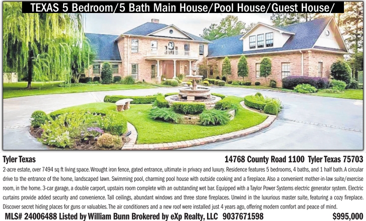 14768 County Road 1100 Tyler Texas 75703 2-acre estate, over 7494 sq ft living space. Wrought iron fence, gated entrance, ultimate inprivacy and luxury. Residence features 5 bedrooms, 4 baths, and 1 half bath. A circular drive to the entrance of the home, landscaped lawn. Swimming pool, charming pool house with outside cooking and a fireplace. Also a convenient mother-in-law suite/exercise room, in the home. 3-car garage, a double carport, upstairs room complete with an outstanding wet bar. Equipped with a Taylor Power Systems electric generator system. Electric curtains provide added security and convenience. Tall ceilings, abundant windows and three stone fireplaces. Unwind in the luxurious master suite, featuring a cozy fireplace. Discover secret hiding places for guns or valuables. The air conditioners and a new roof were installed just 4 years ago, offering modern comfort and peace of mind. MLS# 24006488 Listed by William Bunn Brokered by eXp Realty, LLC 9037671598 $995,000