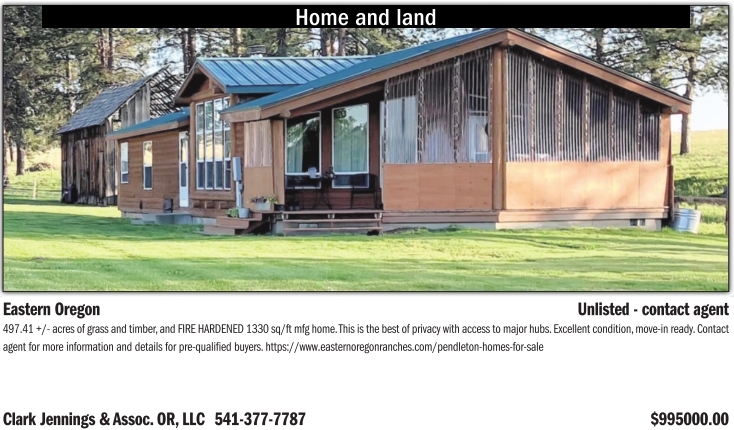 Home and land Eastern Oregon Unlisted - contact agent 497.41 +/- acres of grass and timber, and FIRE HARDENED 1330 sq/ft mfg home. This is the best of privacy with access to major hubs. Excellent condition, move-in ready. Contact agent for more information and details for pre-qualified buyers. https://www.easternoregonranches.com/pendleton-homes-for-sale Clark Jennings & Assoc. OR, LLC 541-377-7787 $995000.00