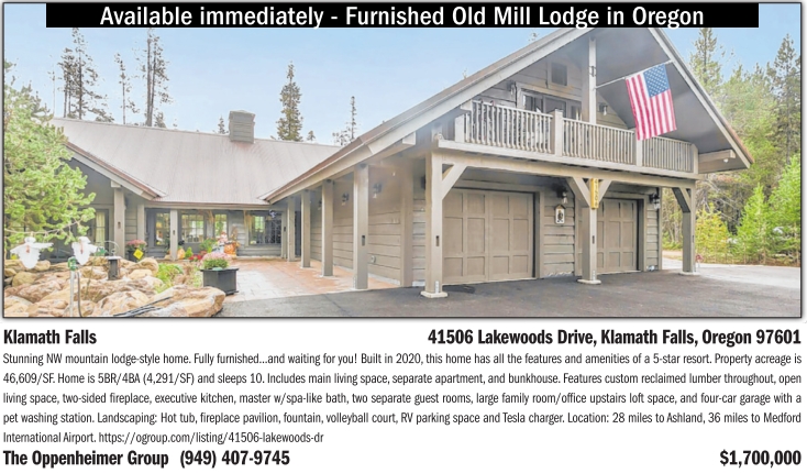 41506 Lakewoods Drive, Klamath Falls, Oregon 97601 Stunning NW mountain lodge-style home. Fully furnished...and waiting for you! Built in 2020, this home has all the features and amenities of a 5-star resort. Property acreage is 46,609/SF. Home is 5BR/4BA (4,291/SF) and sleeps 10. Includes main living space, separate apartment, and bunkhouse. Features custom reclaimed lumber throughout, open living space, two-sided fireplace, executive kitchen, master w/spa-like bath, two separate guest rooms, large family room/office upstairs loft space, and four-car garage with a pet washing station. Landscaping: Hot tub, fireplace pavilion, fountain, volleyball court, RV parking space and Tesla charger. Location: 28 miles to Ashland, 36 miles to Medford International Airport. https://ogroup.com/listing/41506-lakewoods-dr The Oppenheimer Group (949)407-9745 $1,700,000