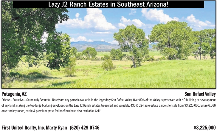 Lazy J2 Ranch Estates in Southeast Arizona! Patagonia, AZ San Rafael Valley Private – Exclusive – Stunningly Beautiful! Rarely are any parcels available in the legendary San Rafael Valley. Over 80% of the Valley is preserved with NO building or development of any kind, making the two large building envelopes on the Lazy J2 Ranch Estates treasured and valuable. 430 & 524 acre estate parcels for sale from $3,225,000. Entire 6,066 acre turnkey ranch, cattle & premium grass fed beef business also available. Call! First United Realty, Inc. Marty Ryan (520) 429-0746 $3,225,000