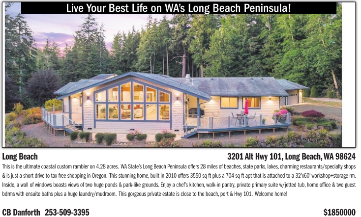 3201 Alt Hwy 101, Long Beach, WA 98624 This is the ultimate coastal custom rambler on 4.28 acres. WA State’s Long Beach Peninsula offers 28 miles of beaches, state parks, lakes, charming restaurants/specialty shops & is just a short drive to tax-free shopping in Oregon. This stunning home, built in 2010 offers 3550 sq ft plus a 704 sq ft apt that is attached to a 32’x60’ workshop+storage rm. Inside, a wall of windows boasts views of two huge ponds & park-like grounds. Enjoy a chef’s kitchen, walk-in pantry, private primary suite w/jetted tub, home office & two guest bdrms with ensuite baths plus a huge laundry/mudroom. This gorgeous private estate is close to the beach, port & Hwy 101. Welcome home! CB Danforth 253-509-3395 $1850000