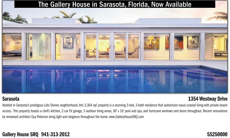 The Gallery House in Sarasota, Florida, Now Available Sarasota 1354 Westway Drive Nestled in Sarasota’s prestigous Lido Shores neighborhood, this 3,364 sqf. property is a stunning 3-bed, 3-bath residence that epitomizes luxury coastal living with private beach access. This property boasts a chef’s kitchen, 2-car EV garage, 3 outdoor living areas, 36’ x16’ pool and spa, and hurricane windows and doors throughout. Recent renovations by renowned architect Guy Peterson bring light and elegance throughout the home. www.GalleryHouseSRQ.com Gallery House SRQ 941-313-2012 $5250000