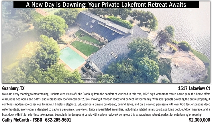 A New Day is Dawning: Your Private Lakefront Retreat Awaits Granbury, TX 1517 Lakeview Ct Wake up every morning to breathtaking, unobstructed views of Lake Granbury from the comfort of your bed in this rare, 4025 sq ft waterfront estate. A true gem, this home offers 4 luxurious bedrooms and baths, and a brand-new roof (December 2024), making it move-in ready and perfect for your family. With solar panels powering the entire property, it combines modern eco-conscious living with timeless elegance. Situated on a private cul-de-sac, behind gates, and on a coveted peninsula with over 650 feet of pristine deep water frontage, every room is designed to capture panoramic lake views. Enjoy unparalleled amenities, including a lighted tennis court, sparkling pool, outdoor fireplace, and a boat dock with lift for effortless lake access. Beautifully landscaped grounds with custom rockwork complete this extraordinary retreat, perfect for entertaining or relaxing. Cathy McGrath - FSBO 682-205-9601 $2,300,000