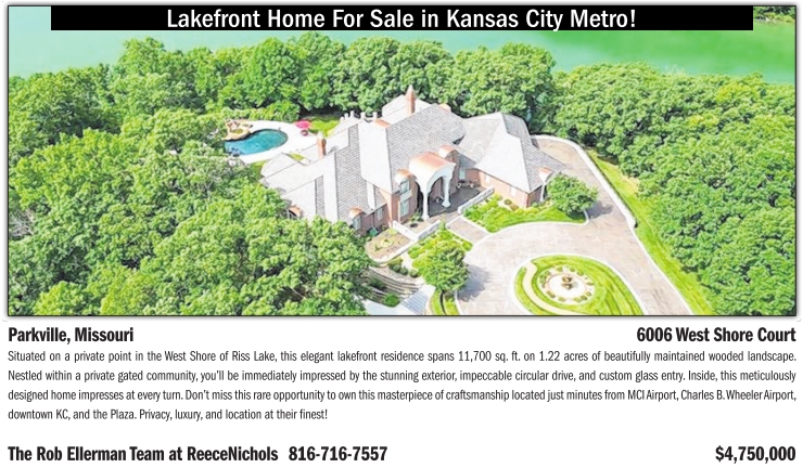 Lakefront Home For Sale in Kansas City Metro! Parkville, Missouri 6006 West Shore Court Situated on a private point in the West Shore of Riss Lake, this elegant lakefront residence spans 11,700 sq. ft. on 1.22 acres of beautifully maintained wooded landscape. Nestled within a private gated community, you’ll be immediately impressed by the stunning exterior, impeccable circular drive, and custom glass entry. Inside, this meticulously designed home impresses at every turn. Don’t miss this rare opportunity to own this masterpiece of craftsmanship located just minutes from MCI Airport, Charles B. Wheeler Airport, downtown KC, and the Plaza. Privacy, luxury, and location at their finest! The Rob Ellerman Team at ReeceNichols 816-716-7557 $4,750,000