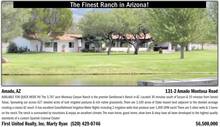 The Finest Ranch in Arizona! Amado, AZ 131-2 Amado Montosa Road AVAILABLE FOR QUICK MOVE IN! The 3,787 acre Montosa Canyon Ranch is the premier Gentleman’s Ranch in AZ. Located 30 minutes south of Tucson & 10 minutes from famed Tubac. Spreading out across 627 deeded acres of lush irrigated pastures & rich native grasslands. There are 3,160 acres of State leased land adjacent to the deeded acreage creating a classic AZ ranch. It has excellent Grandfathered Irrigation Water Rights including 2 irrigation wells that produce over 1,000 GPM each! There are 5 other wells & 3 barns on the ranch. The ranch is surrounded by mountains & enjoys an excellent climate. The main home, guest home, show barn & shop have all been developed to the highest quality standards of a custom Spanish Colonial Estate! First United Realty, Inc. Marty Ryan (520) 429-0746 $6,500,000