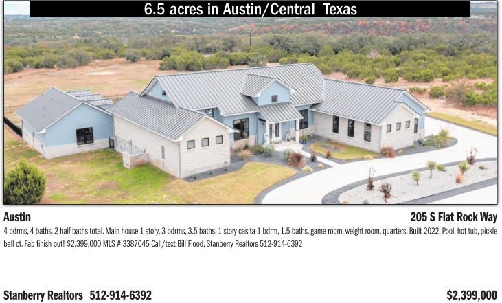 6.5 acres in Austin/Central Texas Austin 205 S Flat Rock Way 4 bdrms, 4 baths, 2 half baths total. Main house 1 story, 3bdrms, 3.5 baths. 1 story casita 1 bdrm, 1.5 baths, game room, weight room, quarters. Built 2022. Pool, hot tub, pickle ball ct. Fab finish out! $2,399,000 MLS# 3387045 Call/text Bill Flood, Stanberry Realtors 512-914-6392 Stanberry Realtors 512-914-6392 $2,399,000