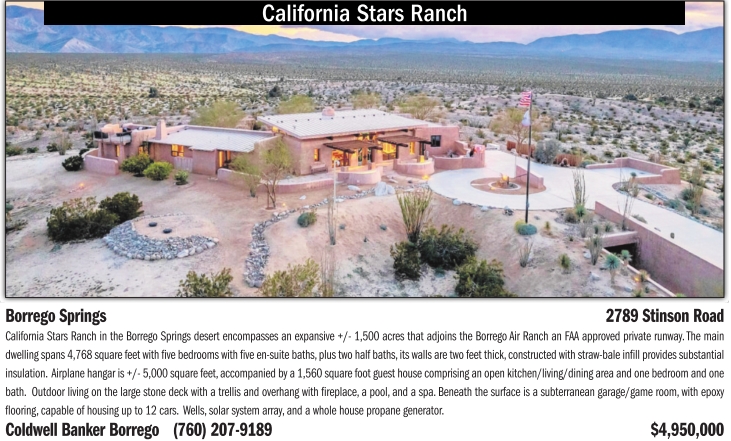 California Stars Ranch Borrego Springs 2789 Stinson Road California Stars Ranch in the Borrego Springs desert encompasses an expansive +/- 1,500 acres that adjoins the Borrego Air Ranch an FAA approved private runway. The main dwelling spans 4,768 square feet with five bedrooms with five en-suite baths, plus two half baths, its walls are two feet thick, constructed with straw-bale infill provides substantial insulation. Airplane hangar is +/- 5,000 square feet, accompanied by a 1,560 square foot guest house comprising an open kitchen/living/dining area and one bedroom and one bath. Outdoor living on the large stone deck with atrellis and overhang with fireplace, a pool, and a spa. Beneath the surface is a subterranean garage/game room, with epoxy flooring, capable of housing up to 12 cars. Wells, solar system array, and a whole house propane generator. Coldwell Banker Borrego (760)207-9189 $4,950,000