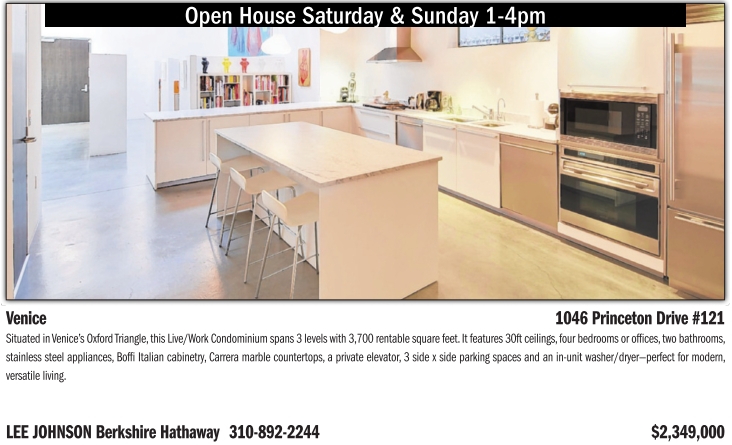 Open House Saturday & Sunday 1-4pm Venice 1046 Princeton Drive #121 Situated in Venice’s Oxford Triangle, this Live/Work Condominium spans 3 levels with 3,700 rentable square feet. It features 30ft ceilings, four bedrooms or offices, two bathrooms, stainless steel appliances, Boffi Italian cabinetry, Carrera marble countertops, a private elevator, 3 side x side parking spaces and an in-unit washer/dryer—perfect for modern, versatile living. LEE JOHNSON Berkshire Hathaway 310-892-2244 $2,349,000