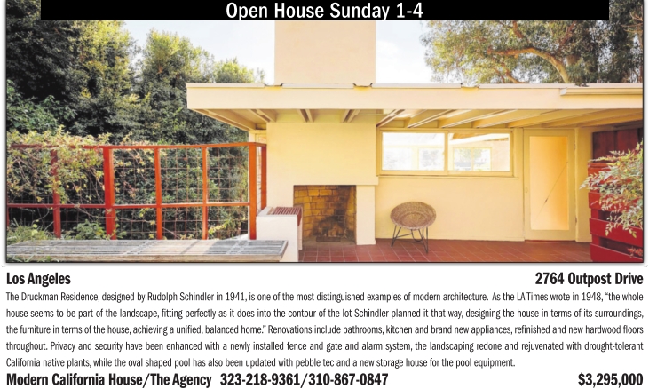 Open House Sunday 1-4 Los Angeles 2764 Outpost Drive The Druckman Residence, designed by Rudolph Schindler in 1941, is one of the most distinguished examples of modern architecture. As the LATimes wrote in 1948, “the whole house seems to be part of the landscape, fitting perfectly as it does into the contour of the lot Schindler planned it that way, designing the house in terms of its surroundings, the furniture interms of the house, achieving a unified, balanced home.” Renovations include bathrooms, kitchen and brand new appliances, refinished and new hardwood floors throughout. Privacy and security have been enhanced with a newly installed fence and gate and alarm system, the landscaping redone and rejuvenated with drought-tolerant California native plants, while the oval shaped pool has also been updated with pebble tec and a new storage house for the pool equipment. Modern California House/The Agency 323-218-9361/310-867-0847 $3,295,000