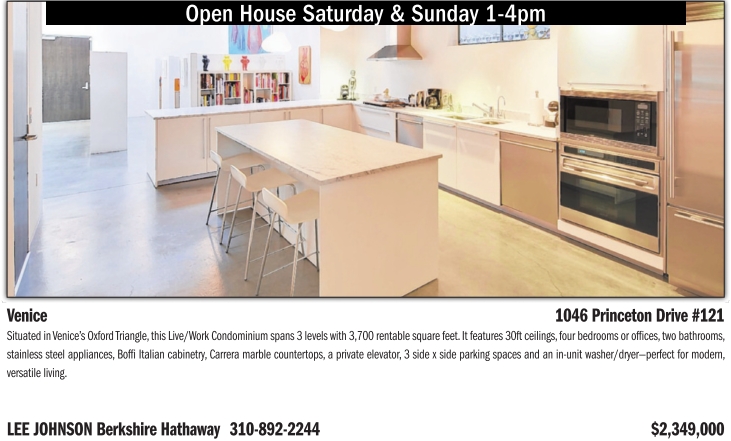 Open House Saturday & Sunday 1-4pm Venice 1046 Princeton Drive #121 Situated in Venice’s Oxford Triangle, this Live/Work Condominium spans 3 levels with 3,700 rentable square feet. It features 30ft ceilings, four bedrooms or offices, two bathrooms, stainless steel appliances, Boffi Italian cabinetry, Carrera marble countertops, a private elevator, 3 side x side parking spaces and an in-unit washer/dryer—perfect for modern, versatileliving. LEE JOHNSON Berkshire Hathaway 310-892-2244 $2,349,000