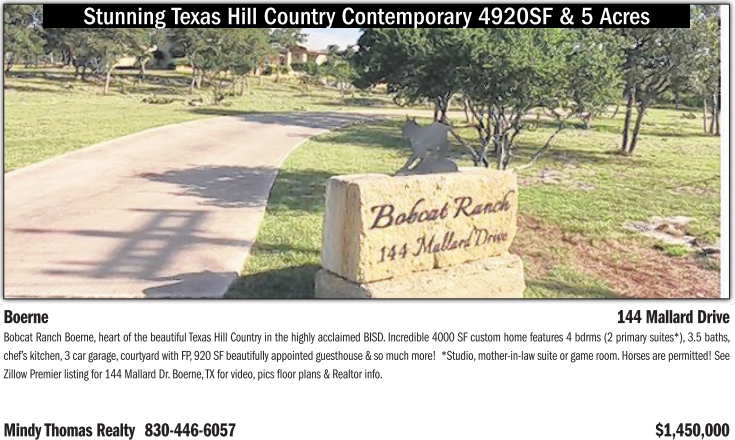 Stunning Texas Hill Country Contemporary 4920SF & 5 Acres Boerne 144 Mallard Drive Bobcat Ranch Boerne, heart of the beautiful Texas Hill Country in the highly acclaimed BISD. Incredible 4000 SF custom home features 4 bdrms (2 primary suites*), 3.5 baths, chef’s kitchen, 3 car garage, courtyard with FP, 920 SF beautifully appointed guesthouse & so much more! *Studio, mother-in-law suite or game room. Horses are permitted! See Zillow Premier listing for 144 Mallard Dr. Boerne, TX for video, pics floor plans & Realtor info. Mindy Thomas Realty 830-446-6057 $1,450,000