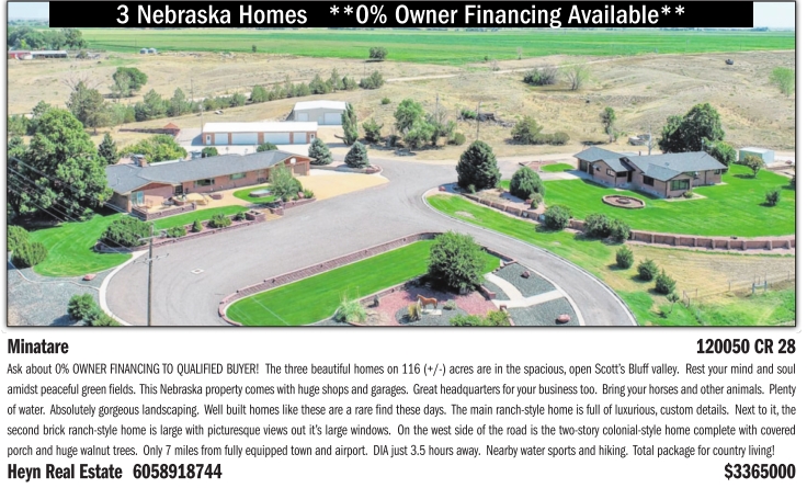 120050 CR 28 Ask about 0% OWNER FINANCING TO QUALIFIED BUYER! The three beautiful homes on 116(+/-) acres are in the spacious, open Scott’s Bluff valley. Rest your mind and soul amidst peaceful green fields. This Nebraska property comes with huge shops and garages. Great headquarters for your business too. Bring your horses and other animals. Plenty of water. Absolutely gorgeous landscaping. Well built homes like these are arare find these days. The main ranch-style home isfull of luxurious, custom details. Next to it, the second brick ranch-style home is large with picturesque views out it’s large windows. On the west side of the road is the two-story colonial-style home complete with covered porch and huge walnut trees. Only 7 miles from fully equipped town and airport. DIA just 3.5 hours away. Nearby water sports and hiking. Total package for country living! Heyn Real Estate 6058918744 $3365000