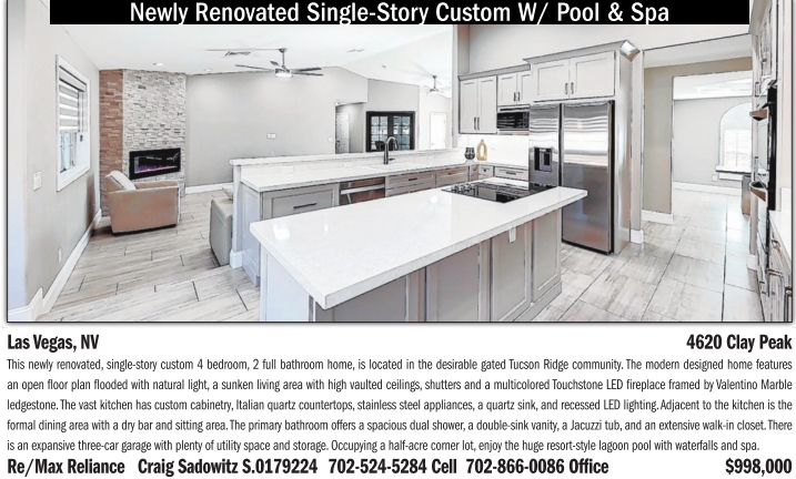 Newly Renovated Single-Story Custom W/Pool & Spa Las Vegas, NV 4620 Clay Peak This newly renovated, single-story custom 4 bedroom, 2 full bathroom home, is located in the desirable gated Tucson Ridge community. The modern designed home features an open floor plan flooded with natural light, a sunken living area with high vaulted ceilings, shutters and a multicolored Touchstone LED fireplace framed by Valentino Marble ledgestone. The vast kitchen has custom cabinetry, Italian quartz countertops, stainless steel appliances, a quartz sink, and recessed LED lighting. Adjacent to the kitchen is the formal dining area with a dry bar and sitting area. The primary bathroom offers a spacious dual shower, a double-sink vanity, a Jacuzzi tub, and an extensive walk-in closet. There is an expansive three-car garage with plenty of utility space and storage. Occupying a half-acre corner lot, enjoy the huge resort-style lagoon pool with waterfalls and spa.