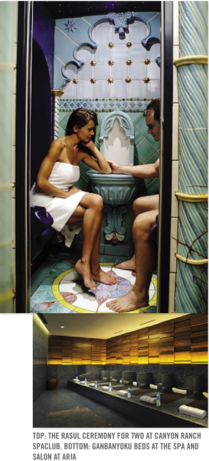 Next stop: the Middle East. With one of the most expansive services menus is Vegas, the Canyon Ranch SpaClub at the Venetian and the Palazzo (www.canyon-ranch.com/spaclub/las_vegas_nv) offers a treatment right out of Arabian Nights: the Rasul Ceremony ($150 to $195). Once a ritual for women of the harem, this mud-purifying ceremony for one or two people is performed in a beehive-shaped Rasul chamber adorned with mosaic and gilded tiles and complete with heated seats. First, you (and your partner) are coated with colorful detoxifying mud, absorbing all manner of icky toxins. Next, warm herb-infused steam fills the chamber, cleansing you inside and out. Finally, from the (faux) starry ceiling, an invigorating rain shower washes the mud (and all your cares) away.