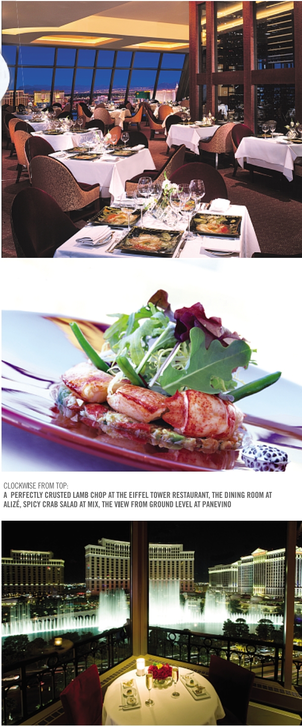 Alizé at the top of the Palms (702.951.7000) boasts one of the most dramatic perspectives of the Strip in town, courtesy of 16-foot floor-to-ceiling windows that offer a staggering 280-degree view. As if the view from this 56th-floor perch weren´t impressive enough, the menu by Chef André Rochat is just as exquisite. Particularly delectable dishes include the imported Dover sole served three ways: Véronique, Grenobloise or Amandine.