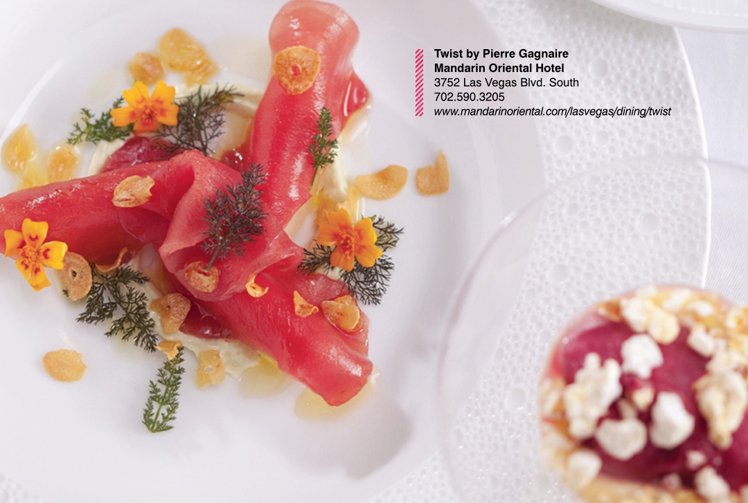 Twist by Pierre Gagnaire Could it be Monsieur Gagnaire, chef extraordinaire, in Las Vegas? Mais oui! Find out what the buzz is all about at Twist, the three-Michelin-star chef’s first restaurant in the United States. The menu infuses the simplicity of classic French cuisine with a modern “twist,” relying on the unusual, unexpected and even baffling flavor pairings for which Gagnaire is renowned — think tiny cubes of Guinness gelee, potato chips with sardines woven into to them, braised filet of squab topped with sweet potato ice cream. Set on the uber-cool 23rd floor of the Mandarin with fabulous views of the glittering Vegas skyline, Twist is more than a restaurant — it’s an experience. See also