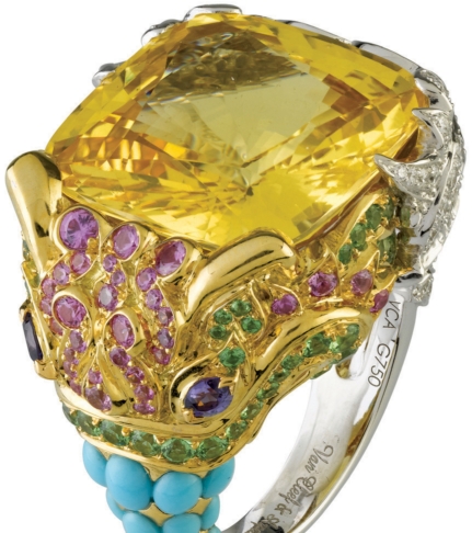 A little bauble can really separate you from the pack. This ring features diamonds, peridots, turquoise and sapphire in yellow, mauve and pink. As they say, if you have to ask the price . . .