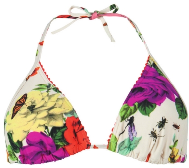 Bloom like a desert flower in this rose-patterned bikini. The triangle top (with easily removable chicken fillets) ties around the neck and back; the bottom ties on the sides.