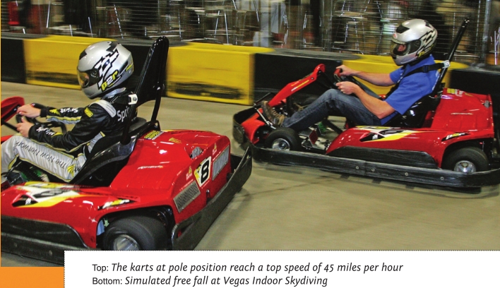 Heat Beaters Just because it’s a million degrees out doesn’t mean there’s nothing to do. When the thermometer hits triple digits in Las Vegas, most people duck into air-conditioned casinos or plunge into the nearest pool. But there are loads of other ways to beat the heat in a city that simmers throughout the summer.  One of our favorite places to chill out is the Las Vegas Ice Center. The two-rink arena offers ice skating for all ages as well as pickup hockey games for adults and stick-and-puck practice sessions for kids. Visitors with Olympic aspirations can also try figure skating lessons. Pole Position Raceway offers a whole different brand of rush: electric gokarts careening around a quarter-mile air-conditioned indoor track. “These aren’t the karts that you remember as a kid,” Pole Position president Ken Faught said. “These karts are capable of 45 mph, offer impressive acceleration, and we allow up to 13 racers to compete in side-by-side-action at one time. It’s arguably the closest thing to real racing that most people will ever experience in their lifetime.” For a decidedly windier experience, check out Vegas Indoor Skydiving, a vertical wind tunnel with enough upward oomph to hold a fully grown adult in simulated free fall. With padded walls and a mesh trampoline floor, there’s plenty of latitude for even beginners to attempt somersaults and other aerial acrobatics. Skydive solo, tandem or with a group of friends. The coolest place to chill out indoors could very well be Qua Baths & Spa at Caesars Palace — particularly the Arctic Ice Room therein. Cooled to a crisp 55 degrees and bathed in soft blue light, the space sits beneath a domed ceiling with twinkling lights that resemble the night sky. Every few minutes the ceiling releases a gentle flurry of snowflakes that alight on your bare arms and legs. But heated benches and floor keep the room from feeling uncomfortably cool. See also