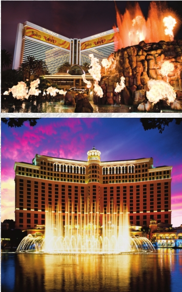 From top to bottom: The Mirage Volcano; the Fountains of Bellagio; the Bellagio Conservatory and Botanical Gardens.
