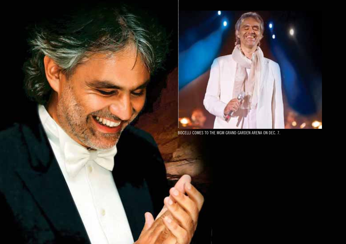 Returning to Las Vegas Launching him from humble beginnings to iconic status, Andrea Bocelli’s genre-straddling style and inimitably romantic timbre have helped classical music cross over into the mainstream. The appreciation of his art will continue in Las Vegas, where nearly 17,000 fans will make their devotion loudly felt at the MGM Grand in December.