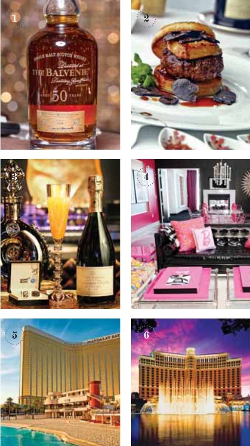 Sink into a tufted armchair at the Talon Club high-stakes gaming room and enjoy a wee dram of rare Balvenie, a 50-year-old single-malt Scotch whiskey, straight from the hogshead cask in the Scottish Highlands. Sampling the $30,000 bottle of booze is $3,400 per 1.5 oz. THE COSMOPOLITAN OF LAS VEGAS 3708 Las Vegas Blvd. South 702.698.7000 www.cosmopolitanlasvegas.com