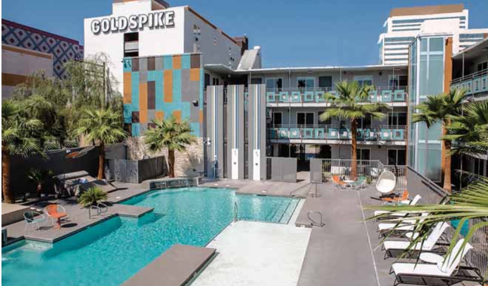 The 44-room Oasis is a former 1960s motel, which reopened in September after a tasteful renovation. Quirky and quaint, the nonsmoking, nongaming hotel is connected to the adjacent Gold Spike Hotel and Casino via an outdoor lounge, allowing guests access to its pool and a back yard boasting outdoor fun and games.