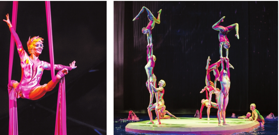 O (pronounced eau as in the French word for water) mesmerizes audiences with synchronized swimming as well as aerial and ground acrobatics taking place in and around a 1.5 million gallon pool.