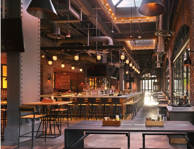food amid rustic warehouse decor. With TVs viewable from almost any seat, this