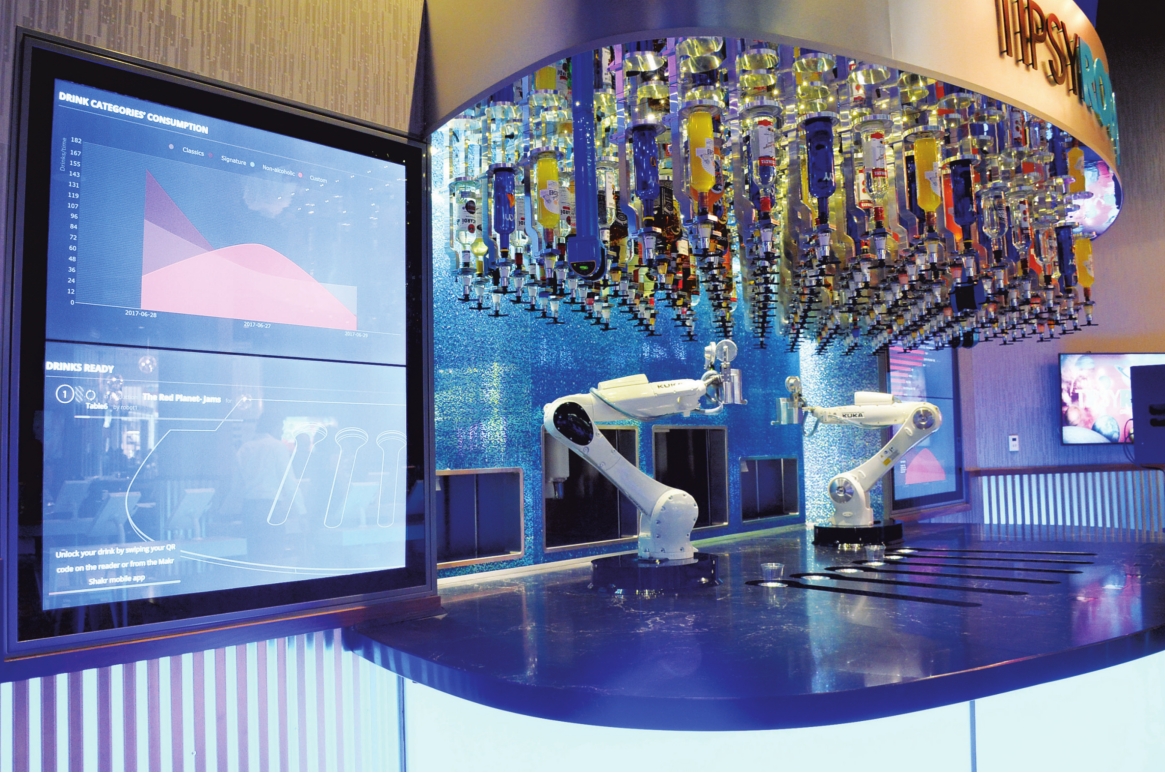 Each beverage takes 70 to 90 seconds from order to completion. A drink costs $14, including tip for the human help. Since everyone isn’t tech-savvy, there are “Galactic Ambassadors,” staff that provide tech support. These robots only pour stiff ones, so guests desiring beer or wine can get a person to pour them one, sit back and enjoy the show.
