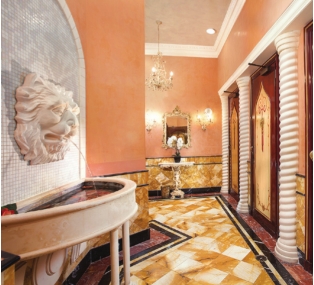 bathroom features luxurious details like limestone columns, Carrera marble and