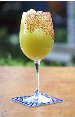 strainer. Rim a wine glass with Tajin salt. Pour in 3/4oz. of the green Bloody