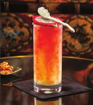 Instructions: Shake the first five ingredients with ice. Strain over fresh ice and drizzle with blood orange puree over the top. Garnish with dragon fruit slice and a spoonful of lychee pearls.