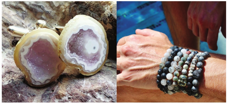 Emsum crystal geode and sterling silver cufflinks, $169 Emsum gemstone bracelets accented with diamonds, sterling silver and rare crystals $195 See also
