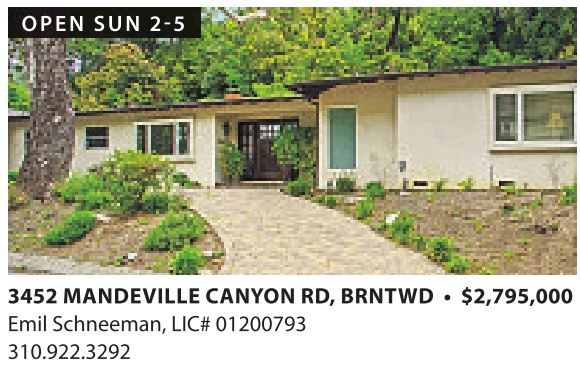 OPEN SUN 2-5 3452 MANDEVILLE CANYON RD, BRNTWD • $2,795,000 Emil Schneeman, LIC# 01200793 310.922.3292 See also