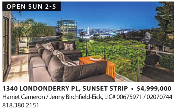 OPEN SUN 2-5 1340 LONDONDERRY PL, SUNSET STRIP • $4,999,000 Harriet Cameron / Jenny Birchfield-Eick, LIC# 00675971 / 02070744 818.380.2151 See also