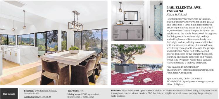 The Details Location: 4461 Ellenita Avenue, Tarzana 91356 Asking price: $1,999,000 Year built: N/A Living area: 2,663 square feet, 3 bedrooms, 3 bathrooms 4461 ELLENITA AVE. TARZANA Hilton & Hyland Contemporary turnkey gem in Tarzana, offering privacy and views for under $2MM. This three-bed + three-bath home features 2,600+ sq ft of living space on a 24,012-sq-ft lot, tucked into Corbin Canyon Park with no neighbors to the south. Remodeled throughout, the living room showcases high ceilings and a fireplace and flows seamlessly into the bright and airy dining area and kitchen with scenic canyon views. A sunken lowerlevel living room grants access to the garage and backyard. About half of the second floor is dedicated to the primary bedroom, featuring an ensuite bathroom and walk-in closet. The two guest rooms have canyon views and share a hallway bathroom. Paul Salazar, DRE#: 01763227 310.492.0737 / info@paulsalazargroup.com PaulSalazarGroup.com Kyle Amicucci, DRE#: 02063153 310.492.0732 / kyle@paulsalazargroup.com Hilton & Hyland Features: Fully remodeled; open concept kitchen w/ views and island; sunken living room; barn doors throughout; canyon views; outdoor BBQ; hot tub; no neighbors south; street parking; large primary walk-in closet See also