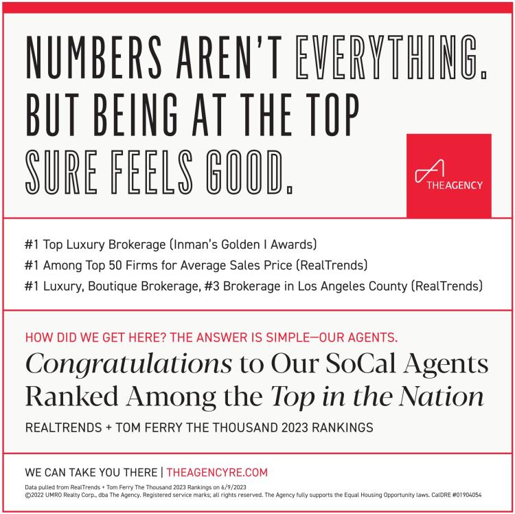 Data pulled from RealTrends + Tom Ferry The Thousand 2023 Rankings on 6/9/2023 ©2022 UMRO Realty Corp., dba The Agency. Registered service marks; all rights reserved. The Agency fully supports the Equal Housing Opportunity laws. CalDRE #01904054