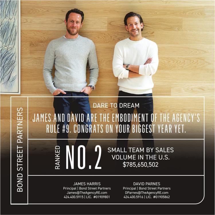 DARE TO DREAM J A M E S A N D D AV I D A R E T H E E M B O D I M E N T O F T H E A G E N C Y ’ S R U L E # 9 . C O N G R AT S O N Y O U R B I G G E S T Y E A R Y E T. N O . 2 SMALL TEAM BY SALES VOLUME IN THE U.S. $785,650,502 JAMES HARRIS Principal | Bond Street Partners James@TheAgencyRE.com 424.400.5915 | LIC. #01909801 DAVID PARNES Principal | Bond Street Partners DParnes@TheAgencyRE.com 424.400.5916 | LIC. #01905862