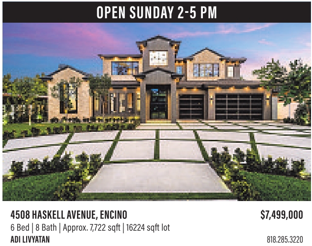 yes OPEN SUNDAY 2-5 PM 4508 HASKELL AVENUE, ENCINO $7,499,000 6 Bed | 8 Bath | Approx. 7,722 sqft | 16224 sqft lot ADI LIVYATAN 818.285.3220 See also
