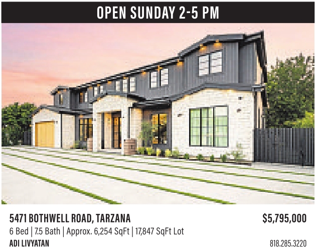 yes OPEN SUNDAY 2-5 PM 5471 BOTHWELL ROAD, TARZANA $5,795,000 6 Bed | 7.5 Bath | Approx. 6,254 SqFt | 17,847 SqFt Lot ADI LIVYATAN 818.285.3220 See also