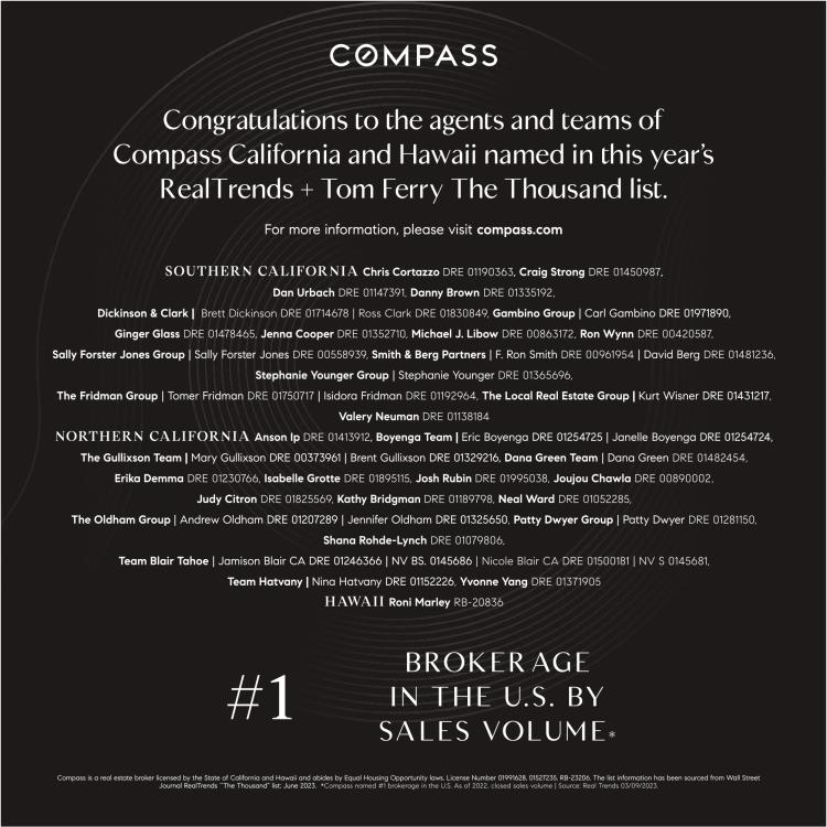Compass is a real estate broker licensed by the State of California and Hawaii and abides by Equal Housing Opportunity laws. License Number 01991628, 01527235, RB-23206. The list information has been sourced from Wall Street Journal RealTrends ``The Thousand” list: June 2023. *Compass named #1 brokerage in the U.S. As of 2022, closed sales volume | Source: Real Trends 03/09/2023.