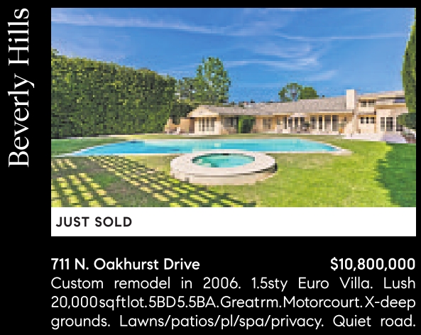 JUST SOLD 711 N. Oakhurst Drive $10,800,000 Custom remodel in 2006. 1.5sty Euro Villa. Lush 20,000sqftlot.5BD5.5BA.Greatrm.Motorcourt. X-deep grounds. Lawns/patios/pl/spa/privacy. Quiet road. See also