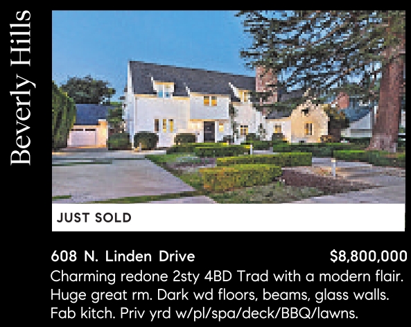 JUST SOLD 608 N. Linden Drive $8,800,000 Charming redone 2sty 4BD Trad with a modern flair. Huge great rm. Dark wd floors, beams, glass walls. Fab kitch. Priv yrd w/pl/spa/deck/BBQ/lawns. See also
