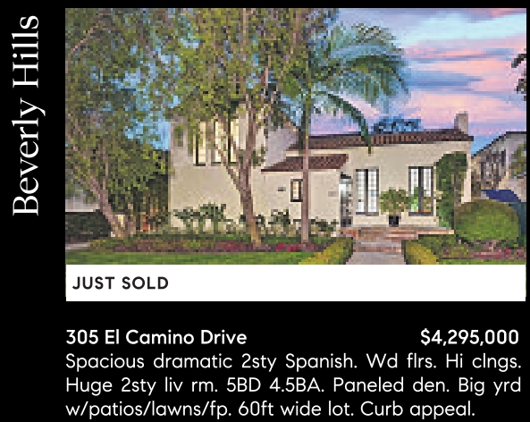 JUST SOLD 305 El Camino Drive $4,295,000 Spacious dramatic 2sty Spanish. Wd flrs. Hi clngs. Huge 2sty liv rm. 5BD 4.5BA. Paneled den. Big yrd w/patios/lawns/fp. 60ft wide lot. Curb appeal. See also