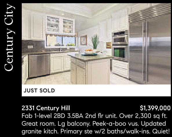 JUST SOLD 2331 Century Hill $1,399,000 Fab 1-level 2BD 3.5BA 2nd flr unit. Over 2,300 sq ft. Great room. Lg balcony. Peek-a-boo vus. Updated granite kitch. Primary ste w/2 baths/walk-ins. Quiet! See also