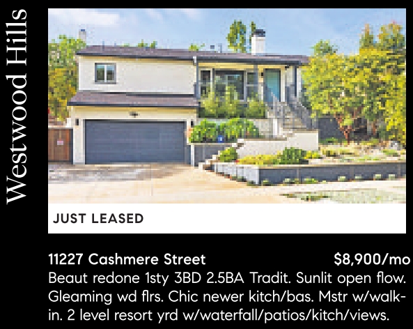 JUST LEASED 11227 Cashmere Street $8,900/mo Beaut redone 1sty 3BD 2.5BA Tradit. Sunlit open flow. Gleaming wd flrs. Chic newer kitch/bas. Mstr w/walkin. 2 level resort yrd w/waterfall/patios/kitch/views. See also