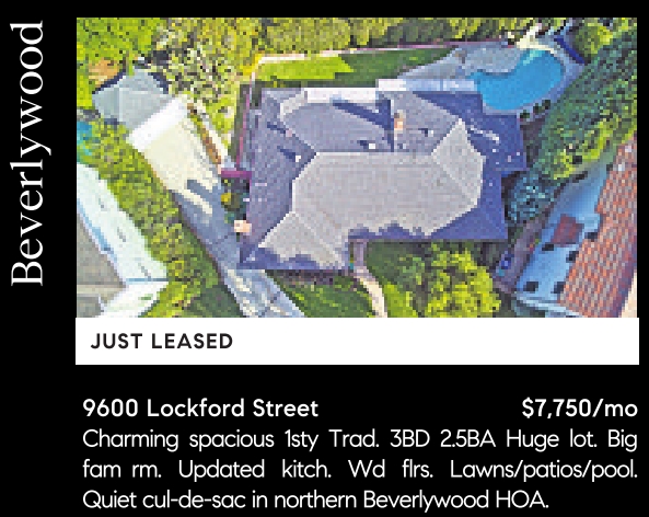 JUST LEASED 9600 Lockford Street $7,750/mo Charming spacious 1sty Trad. 3BD 2.5BA Huge lot. Big fam rm. Updated kitch. Wd flrs. Lawns/patios/pool. Quiet cul-de-sac in northern Beverlywood HOA. See also